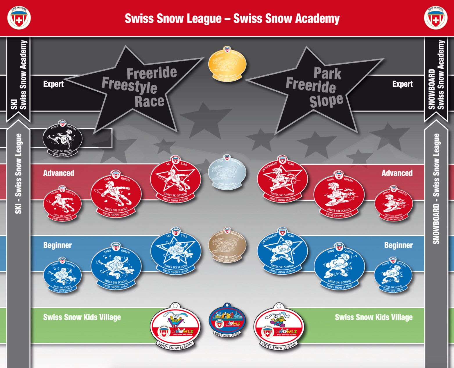 Les Écoles Suisses de Ski utilisent les différents niveaux de la Swiss Snow League. Ils sont composés d’objectifs à atteindre qui correspondent à des étapes essentielles de l’apprentissage du ski ou du snowboard.