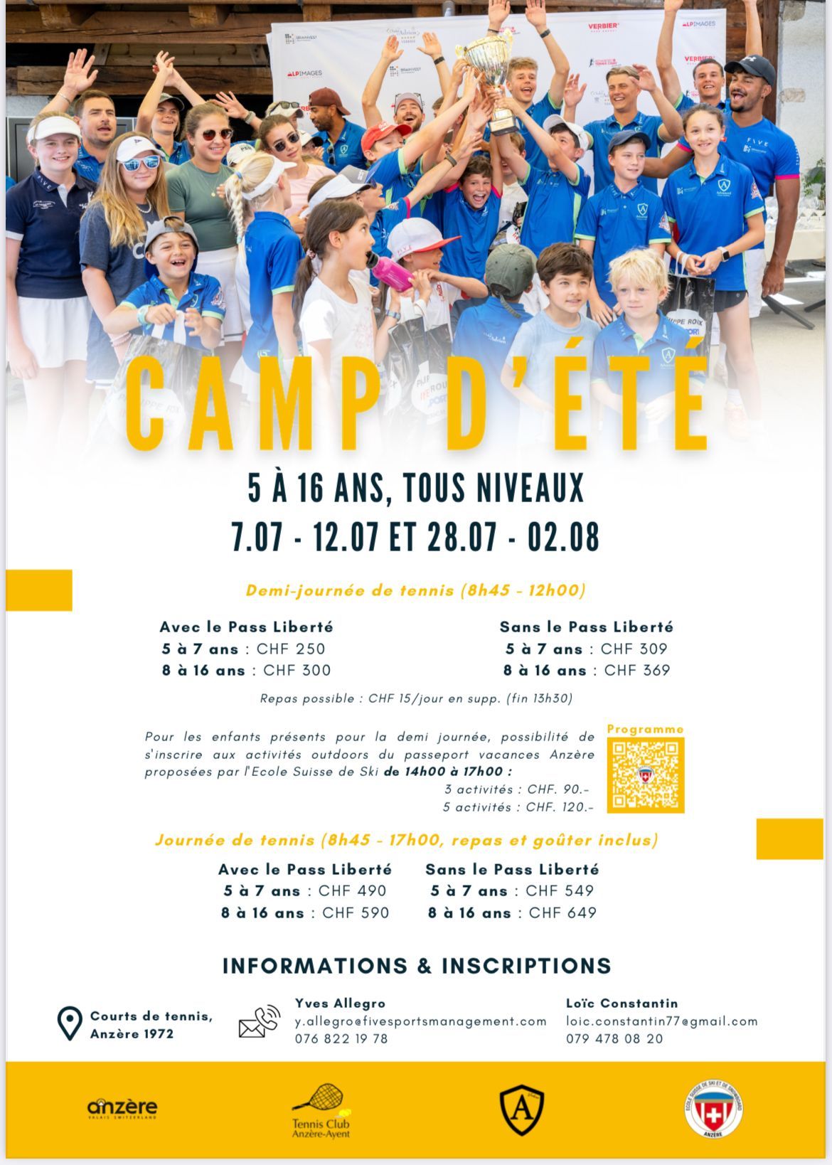 Les cours/camps de tennis sont encadrés par les moniteurs, dont Yves Allegro de Five Sports Management et en collaboration avec l’Ecole Suisse de Ski d’Anzère.
