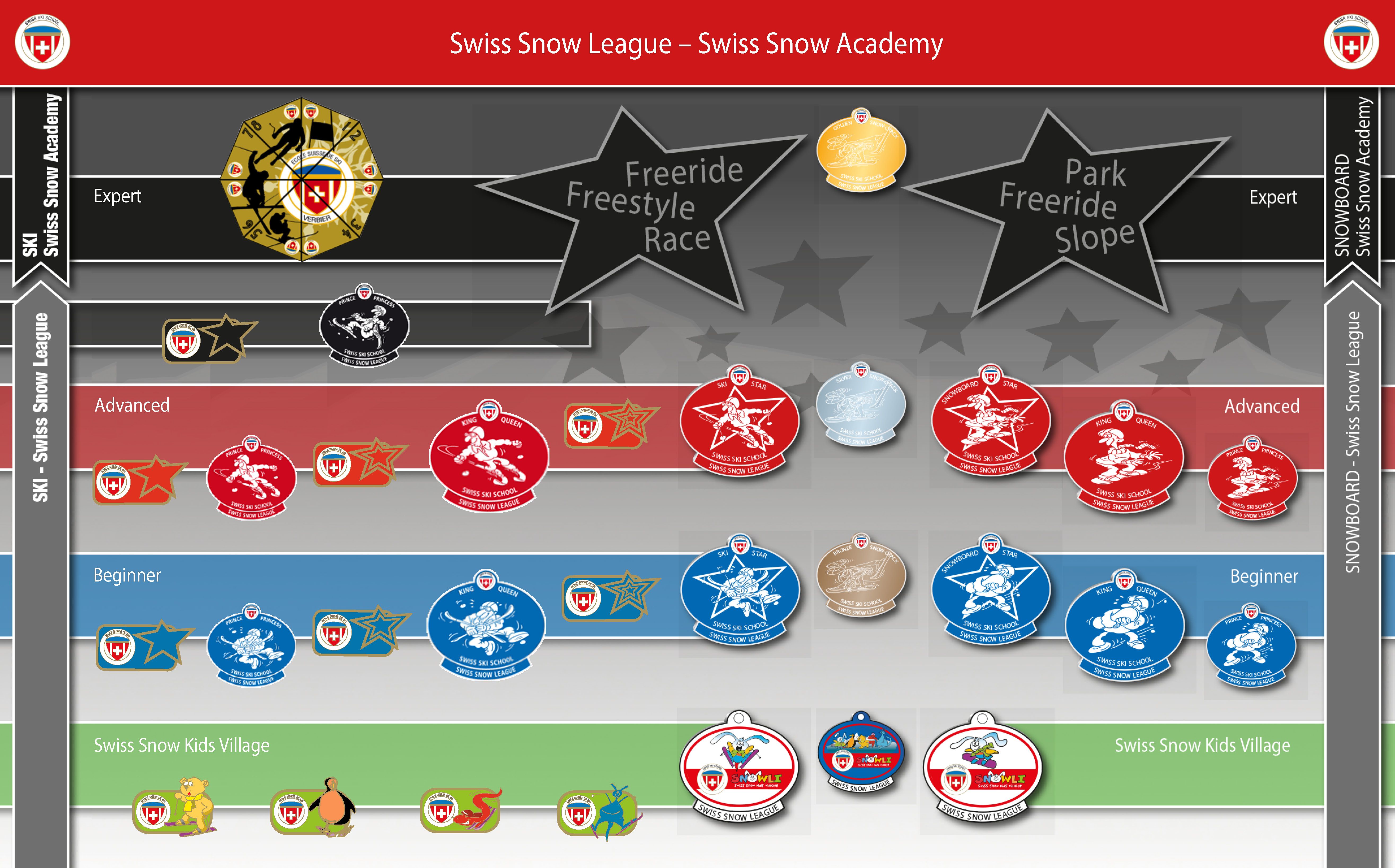 Les Écoles Suisses de Ski utilisent les différents niveaux de la Swiss Snow League. Ils sont composés d’objectifs à atteindre qui correspondent à des étapes essentielles de l’apprentissage du ski ou du snowboard.